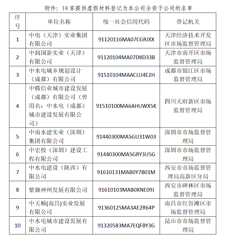 中國水利水電建設集團有限公司(以下簡稱“本公司”)為中國電力建設集團有限公司的全資子公司,法定代表人季曉勇,成立日期為1989年1月3日。在未經本公司許可同意的情況下,先后有10家國內企業擅自將本公司登記為全資股東,他們分別是中電(天津)實業集團有限公司、中水電城鄉規劃設計(成都)有限公司、紫御神州發展有限公司、中天順(南昌)實業發展有限公司、中南水建實業(深圳)集團有限公司、中潤國新實業(天津)有限公司、中騰信業城市建設發展(成都)有限公司[曾用名:中水電(成都)城市建設發展有限公司]、中宏投(深圳)建設工程有限公司、中水電建設(陜西)有限公司、中水電城市建設發展有限公司(以下統稱“假冒企業”)。 本公司從未批準設立、收購、出資注冊上述假冒企業,假冒企業進行登記注冊所使用的涉及本公司的包括:股東決議、股權轉讓協議、本公司營業執照、公司印章和法定代表人簽名在內的所有登記材料均系偽造。 就上述事宜,本公司鄭重聲明如下: 1.本公司從未出資設立上述假冒企業,我公司與以上10家假冒企業不存在任何股權關系,也不存在任何形式的出資、隸屬、關聯或實際控制關系。 2.本公司已分別向10家假冒企業的注冊登記機關進行舉報,現10家假冒企業均已被注銷或撤銷。 3.假冒企業以本公司名義提供虛假材料進行公司登記,本公司對此并不知情也從未同意或授權,假冒企業及其各級下設公司所進行的一切行為均與本公司無關,請社會各界提高警惕。 4.本公司嚴正警告相關不法人員,立即停止以本公司子企業名義對外開展經營活動。否則本公司將通過法律途徑嚴肅追究相關不法人員責任,包括但不限于刑事、行政、民事法律責任,以維護本公司合法權益。 5.本公司提醒投資者、企事業單位、社會公眾,慎重與上述假冒企業及其關聯公司開展業務合作,切實防范風險。 特此聲明。 ? 附件:10家提供虛假材料登記為本公司全資子公司的名單。 ? ? 中國電力建設集團有限公司 中國水利水電建設集團有限公司 2023年6月14日 |
